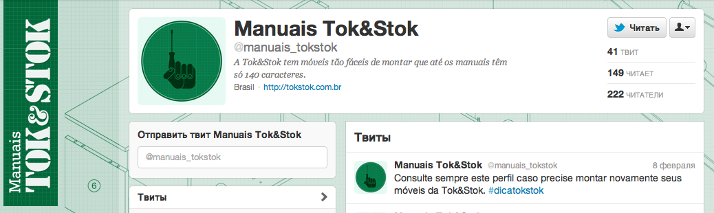 «Твитнуть!», — подумала бразильская мебельная компания TOK&STOK и предложила своим клиентам инновацию. Отныне, все инструкции по сборке мебели TOK&STOK сокращены до 140 символов и размещены на эккаунте компании в Твиттер. Каждый отгруженный клиенту товар содержит наклейку с указанием тэга продукта. Занеся тэг в поиск твиттера, клиент находит инструкцию по сборке.