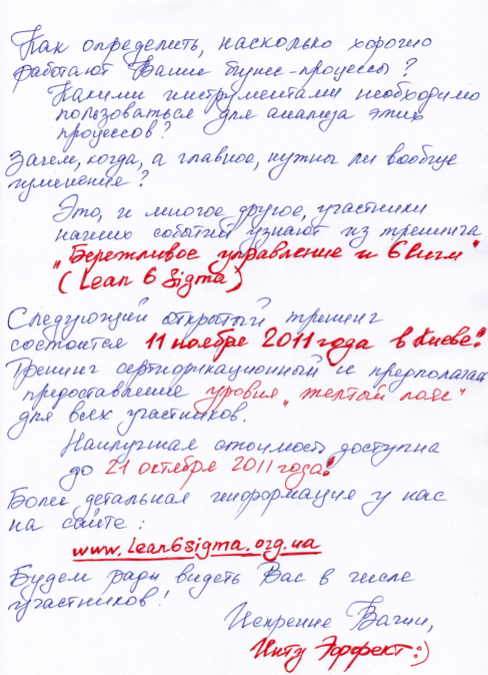 А теперь, серьезно. Технология, о которой пойдет речь на тренинге, родилась в середине прошлого столетия, когда такие рукописные приглашения не были чем-то из ряда вон выходящим, а ранее упомянутые факсы, и вовсе не имели того распространения, в принципе. Более 60 лет технология развивалась, обростая новыми методиками и иструментами. Сегодня, технология «Бережливого управления и 6 Сигм» (Lean Six Sigma) является одной из наиболее прогрессивных и эффективных концепций управления.